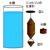 ニコルソンの比重計,水槽,分銅。